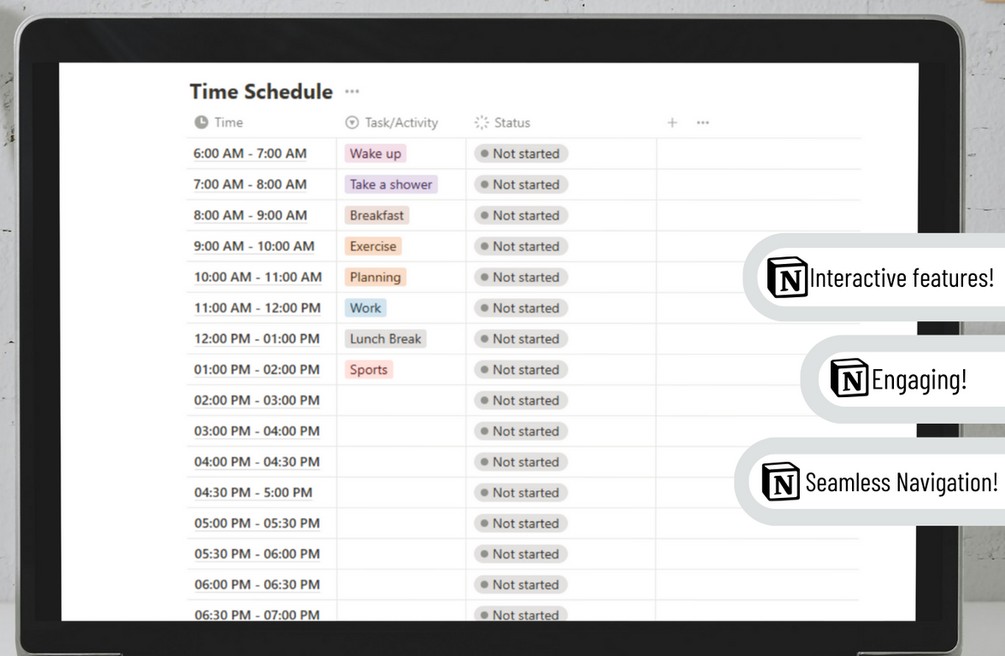 1. Customizable Schedule: Plan your day from 6 AM to 8 PM with a selection option to choose which tasks or activity to complete during that time. Along with that, a status bar where you can track your progress by updating the status of each task, from "Not started", "In Progress", to "Done".